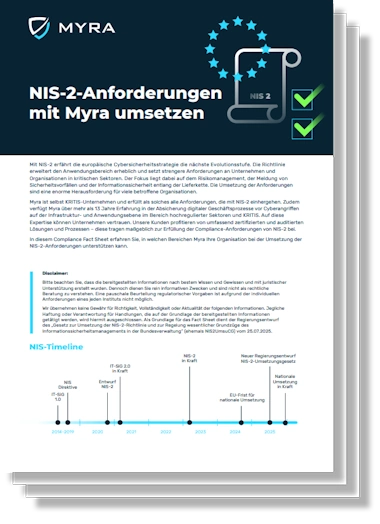 Effizient und schnell NIS-2-Konformität erreichen: Unser Fact Sheet liefert einen kompakten Überblick zu den relevanten Vorgaben der NIS-2-Richtlinie und zeigt, wie Myra Sie dabei unterstützt, regulatorische Cybersecurity-Anforderungen praxisnah, strukturiert und nachhaltig umzusetzen.